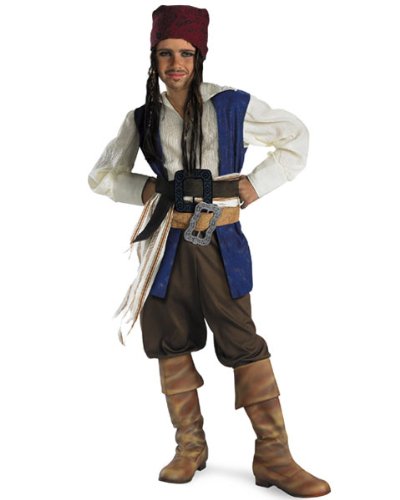 Captain Jack Sparrow never looked so fashionable in the authentically designed costume of the Captain Jack Sparrow Kids Costume. This outfit has as much awesome detail as an adult costume, but with the perfect fit for that special child in your life. This officially licensed pirate look includes a white long sleeved shirt with an attached blue vest. A fabric sash wraps around one of two included belts, with different brown shades and varying buckles, so your son will look like he's spent many years aboard The Black Pearl. Brown pants are included and can be tucked into boots for a unique look. A bold red bandana is also included with attached hair, so your child can have the real life braids of Captain Jack Sparrow! Boots and makeup not included. See our accessories for more fun ideas.