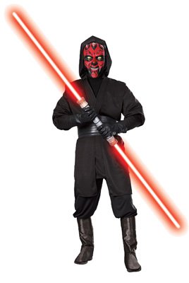 - Deluxe Darth Maul adult costume includes hooded tunic, belt, pants w/ attached boot tops & 1/2 mask.